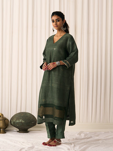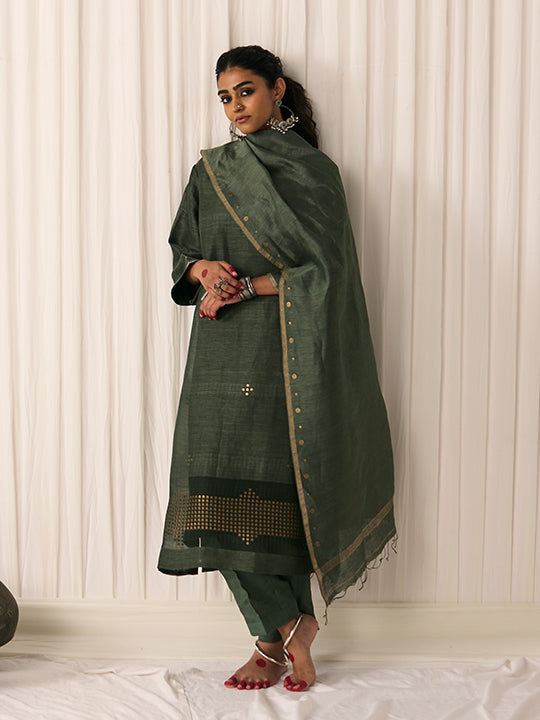 Dupatta: Green silk linen with geometric sequins woven along the golden selvedge