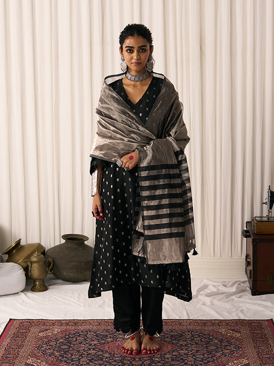 Dupatta: Silver tissue with black chanderi stripes and tassels on the edges