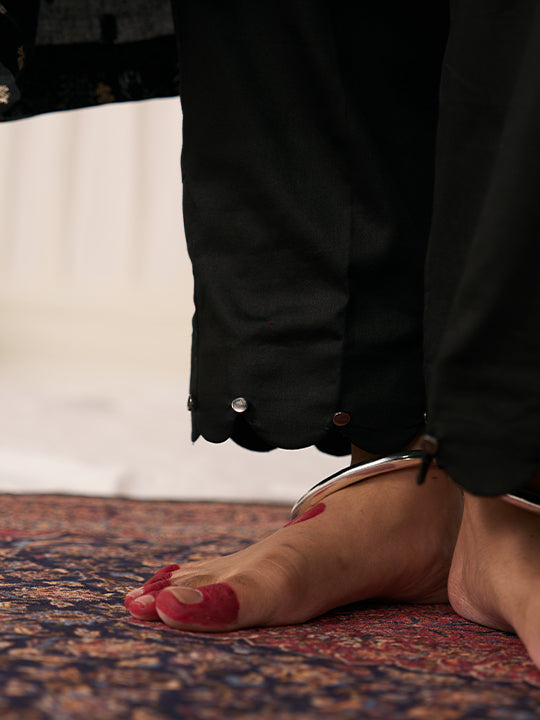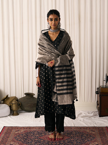 Top: Black chanderi base with silver zari floral booti woven overall