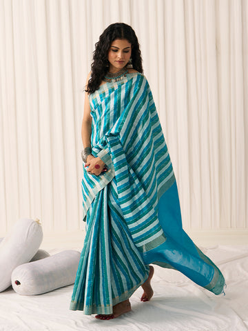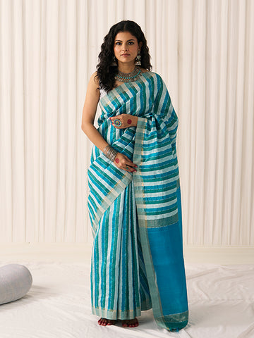 Colour: Turquoise (with organza-tussar stripes overall, resham border, and solid colour organza pallu)