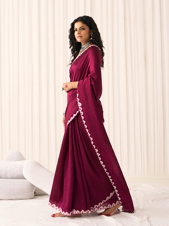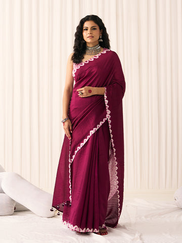 Colour: Wine (with hand-dyed bandhej chevron border and a shibori circle with pearl thread tassels on the pallu)